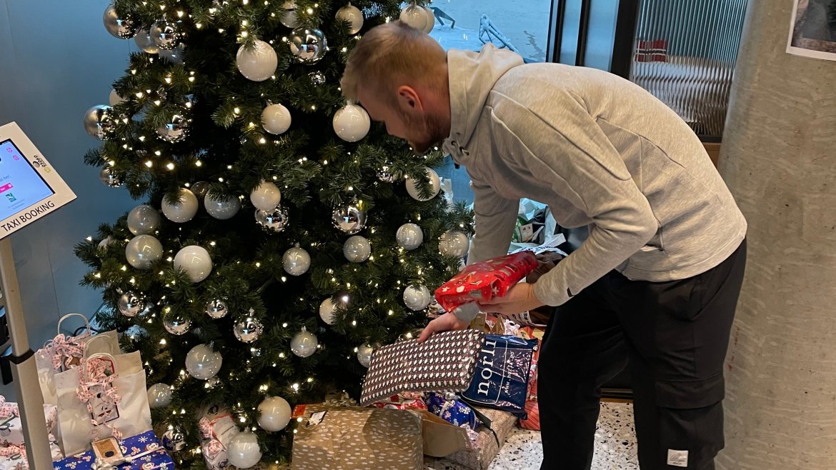 Gavene ble lagt under Kirkens Bymisjons juletre på hotellet. Her kan alle som ønsker det stikke innom og bidra med gaver til barn og familier som ikke har så mye til jul.